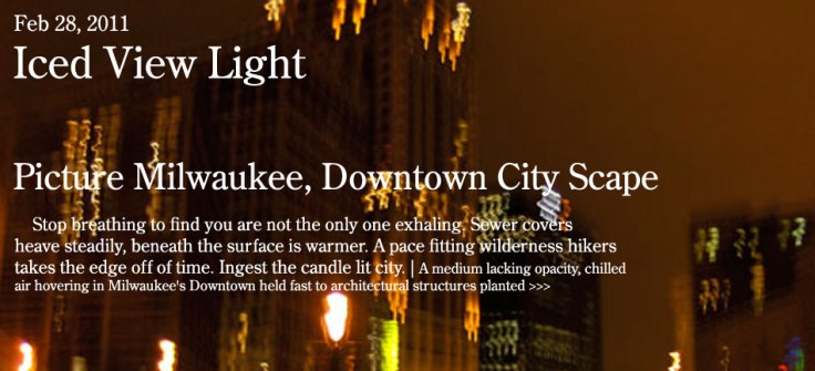 A medium lacking opacity, chilled air hovering in Milwaukee’s Downtown held fast to architectural structures planted in East Town. Milwaukee’s downtown at night possesses serenity mostly reserved for remote forest lands. Stone, metal, and light-emitting-filaments posed in the dark, kept company by a hand full of passing cars, exchange gestures with the concrete below.