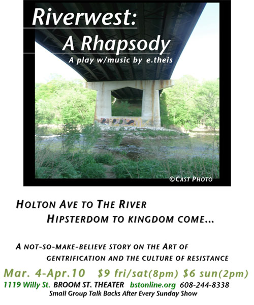 ‘Once upon a time’ used to draw readers into prose insatiably, thankfully, that just won’t do anymore. Young playwrights like Eric Theis take a different route. A native of Wisconsin’s thumb-pit region, Theis traveled and lived his share of the States, settling in the-now-a-days-oft-mentioned Riverwest neighborhood for 5 years. Having had it with the place, referred to as New Brunswick by a friend of mine from New Jersey, Theis made his way to Madison, WI. Before leaving the bitter-sweetness of his experiences in Milwaukee behind, Theis etched a tale of two ‘hoods in his original work Riverwest: A Rhapsody! Yes, exclamation point Rhapsody!, not just ‘rhapsody’. Yes, musical Rhapsody!, with singing. Yes, exclamation point, musical Rhapsody, with singing about a neighborhood in Milwaukee, performed in Madison.
