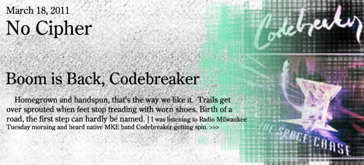 I was listening to Radio Milwaukee Tuesday morning and heard native MKE band Codebreaker getting spin. Might not be the first splash they made on the radio waves, but it’s the first I heard leading in with band name announced before the song.