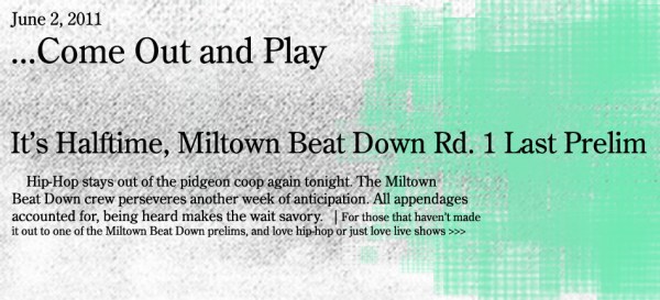 For those that haven't made it out to one of the Miltown Beat Down prelims, and love hip-hop or just love live shows, tonight's the night at the Jackalope. It's intimate, loud and has an underground feel despite the mainstream location. Music of the previous two year's MTBD champions and some worthy upstart producers stream... Continue Reading →