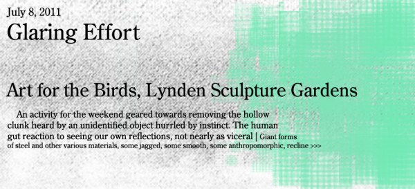 Giant forms of steel and other various materials, some jagged, some smooth, some anthropomorphic, recline on the sprawling lawn of the Lynden Sculpture Garden. A great scene for artists, couples, families and outdoorsy people, or all of the above, the Lynden Sculpture Garden has tours both guided and unguided. However, this coming Sunday at 12:30p... Continue Reading →